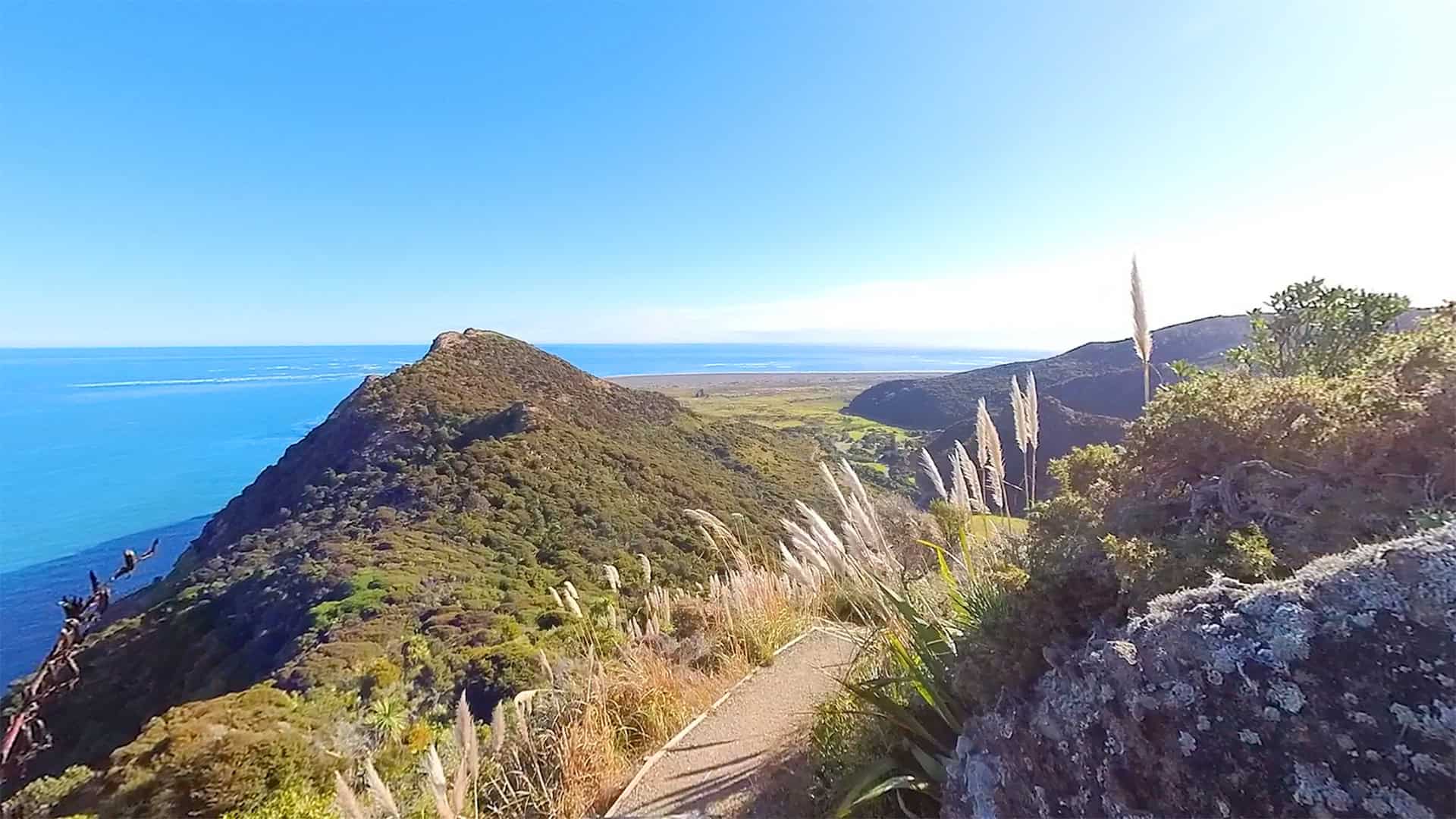 Walking the track virtually, you’ll see thick stands of native bush, low-growing shrubs clinging to the slopes, and if you look (and listen) carefully, the occasional bird flitting through the branches. There’s no big, cinematic moment. No dramatic soundtrack swelling behind a ridge reveal. Just the simple, unhurried pleasure of being immersed in nature, one step at a time.