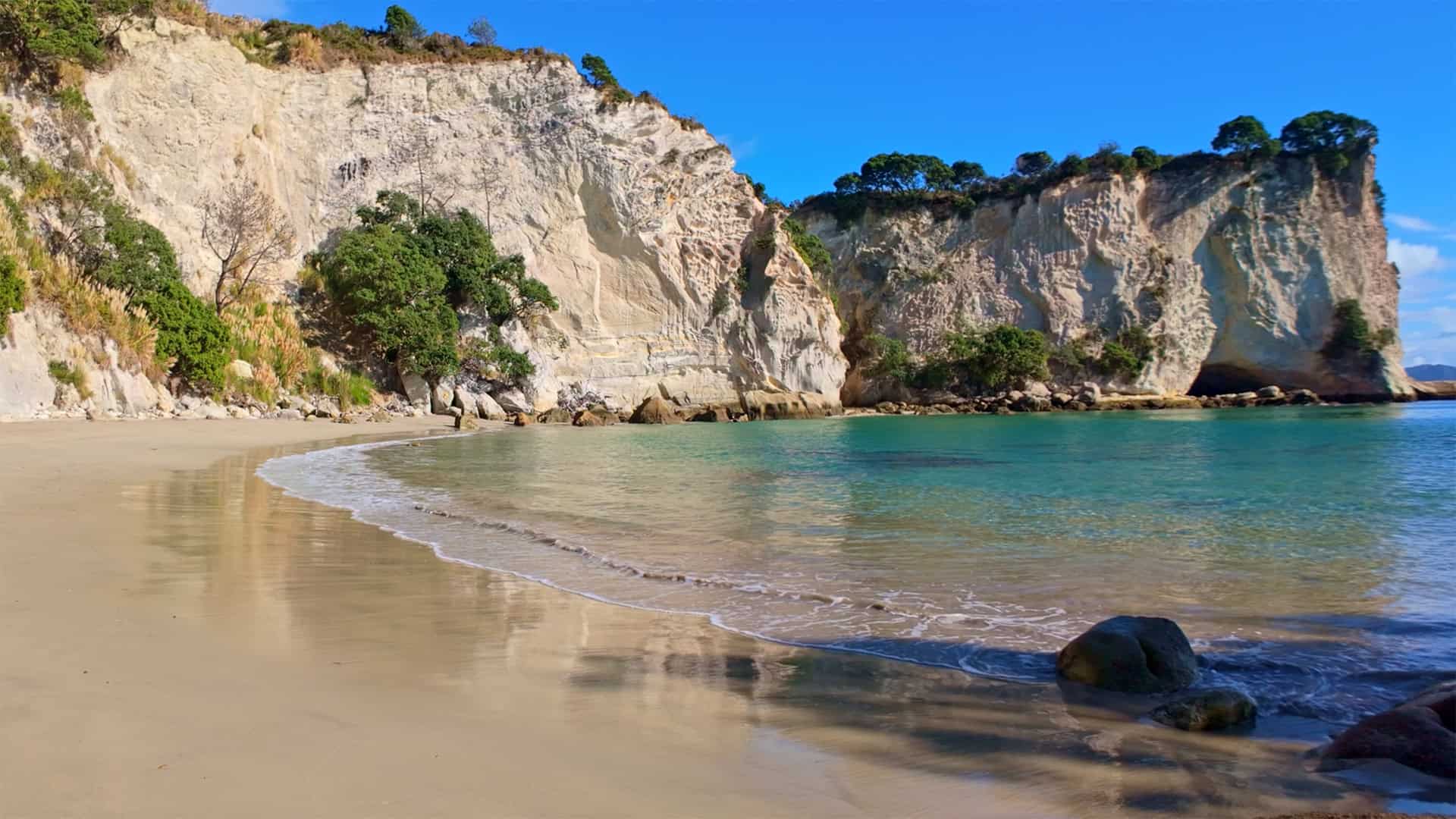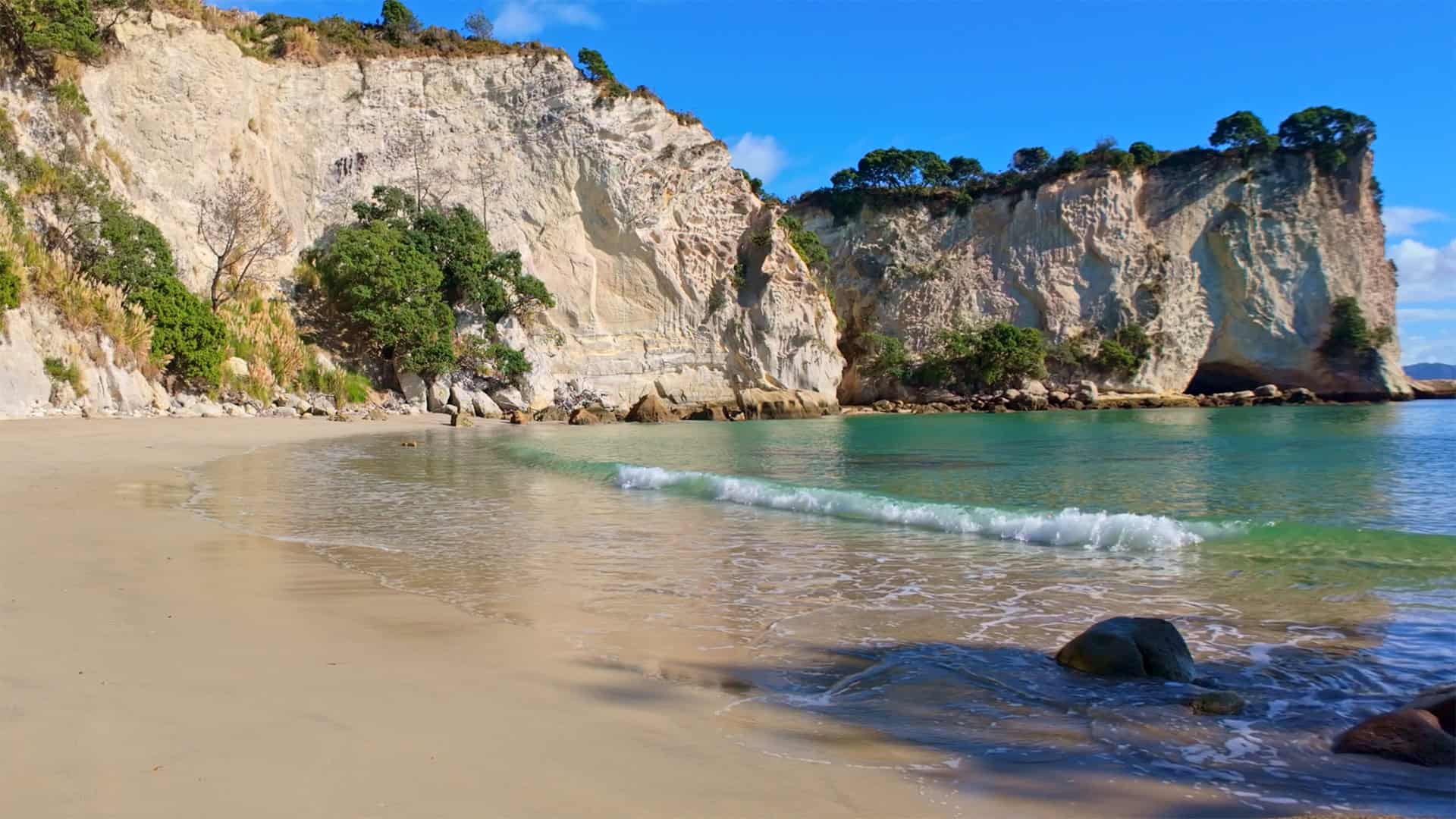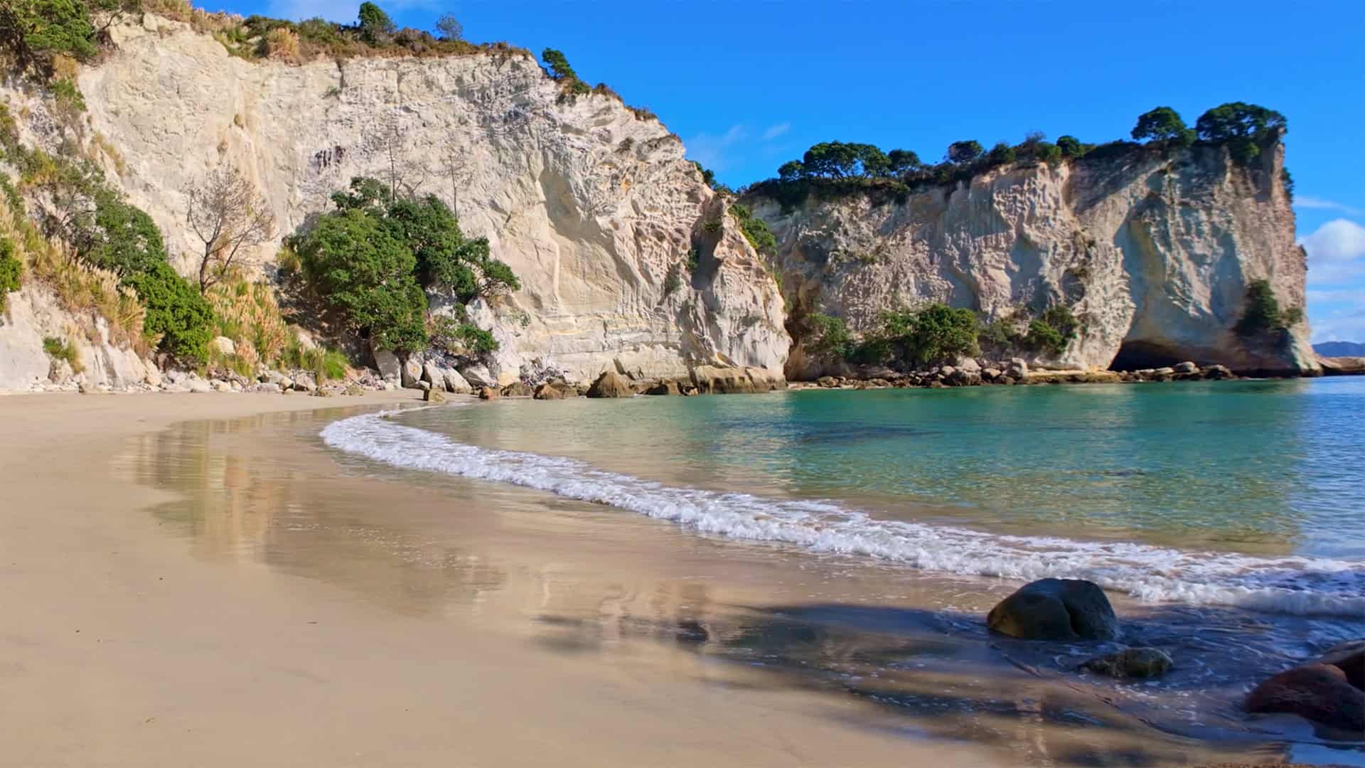That’s what this 8-hour 4K beach film ended up being for me — and maybe for you too. Captured at Stingray Bay, near the more famous Cathedral Cove in New Zealand, it’s just… waves. Water folding and unfolding onto a soft stretch of sand. Sunlight leaning against the cliffs. The occasional sharper splash when the tide catches the rocks a little differently.